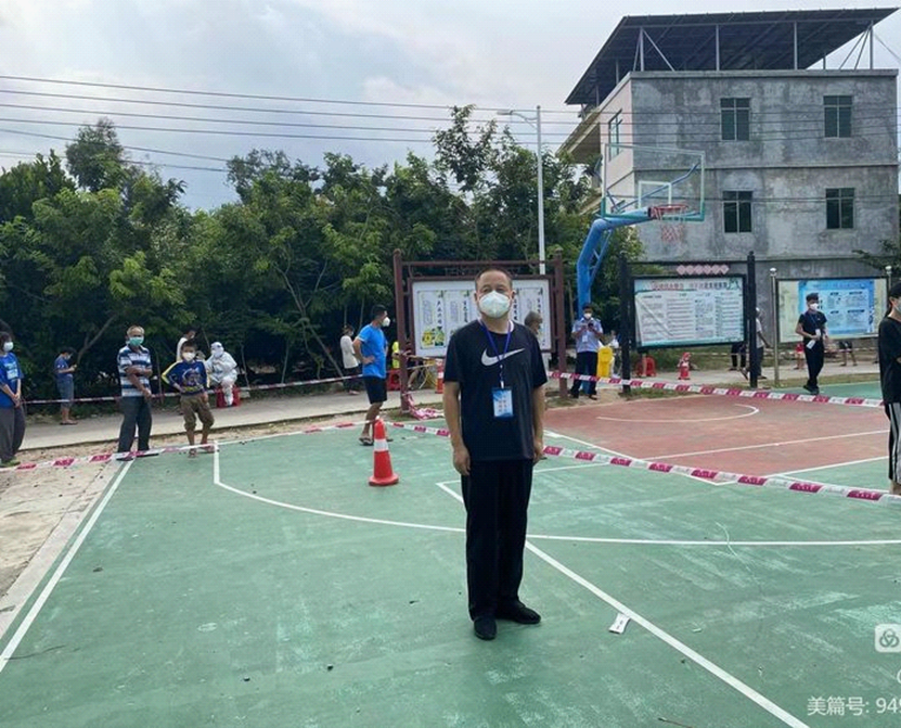 张文军同志在落笔村核酸检测点,负责协助核酸检测维护秩序服务工作,严防疫情交叉传播风险。